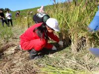 JA女性部の方々からマンツーマンでのご指導のもと、鎌で刈り取りました。