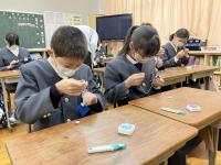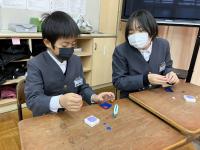 5・6年生は、家庭科で5年生と6年生がペアになってボタン付けをしました。