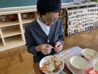 今日は6年生だけ特別にカニ給食です。