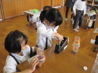 マラカスを鳴らして、どんぐりの量を変え、音が変わるのに気づき、