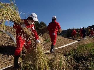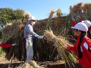 次に、赤米を刈りました。そして、JA女性部の皆さんや保護者が縛った稲を運んで、はざにかけました。