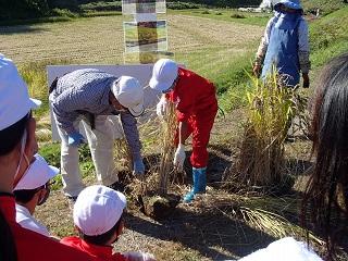 10月19日(水) 5・6年生が、学校田で古代米稲刈り体験をしました。