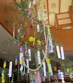 地域の方からいただいた竹に、みんなの願いを書いた短冊や色紙で作った飾りをたくさんつけました。