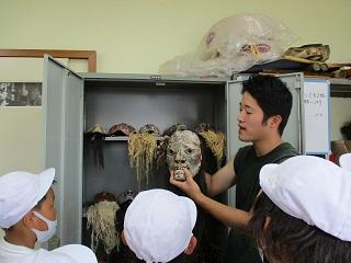 後陣乗太鼓のお面を間近で見て、太鼓も少し叩かせてもらいました。