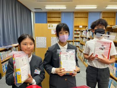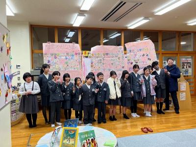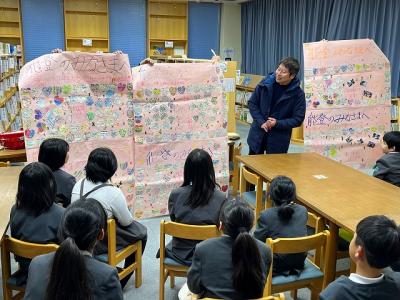 19日に、町野の冨成さんが、大阪府の登美丘東小学校の寄せ書きと共に来校されました。