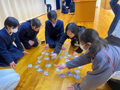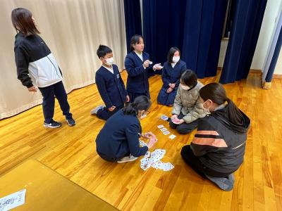 6年生が先生たちとの交流会を企画してくれました。カルタ・トランプ・ドッジボールと鬼ごっこのグループに分かれて、楽しみました。