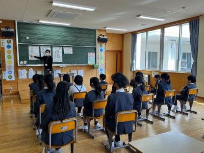 教室では交通安全協会の方からランドセルカバーをいただき、町野駐在所の警察官の方から交通安全のお話を聞きました。