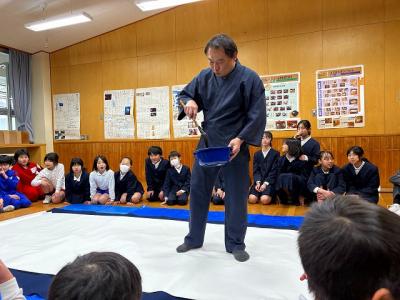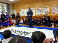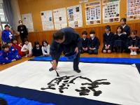 富山県滑川市より、震災復興支援で柳田小とご縁がある、書家の見角竹城(みかど ちくじょう)先生が来校されました。縁をつないでくださった滑川市のショッピングセンターの広橋さんもご一緒です。卒業生の名前と、各学校の希望する文字を大きな紙に書いてくださいました。