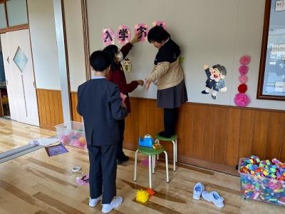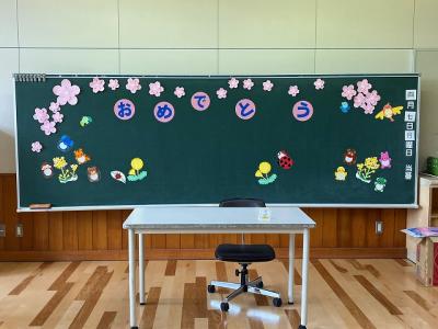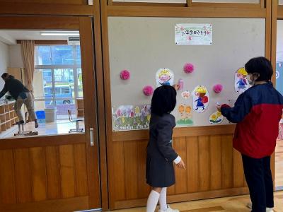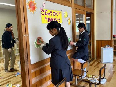 教室、廊下、式場に花を飾ったり歓迎の掲示をしたりしてくれました。
