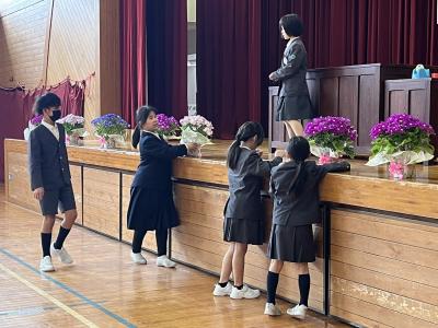 新型コロナウイルス感染症予防のため規模縮小し、6年生、その保護者、教職員のみの参加で行います。規模は縮小しましたが、贈る気持ちは、いつも以上です。会場準備もバッチリですよ。