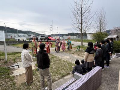 4月8日、学校裏の町野第1団地にチンドンバンドがくるというお知らせをいただき、みんなで観に出ました。