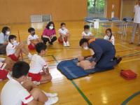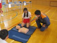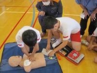 その後東陽中学校へ行き、中学生と一緒に町野消防署の方々から心肺蘇生のポイント等を丁寧に教えてもらいました。