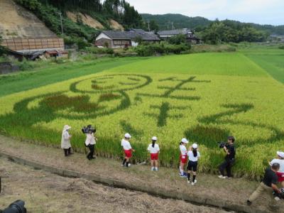 田植えの時にはまだ、できあがりのイメージがはっきりともてなかった子どもたちですが、美しく実った模様に歓声を上げていました。指導してくださった本手繁さんも、「思った以上に美しくできあがってよかった」「みなさんが喜んで見てくれれば、稲もますます元気が出て美味しく育ちます」と言ってくださいました。