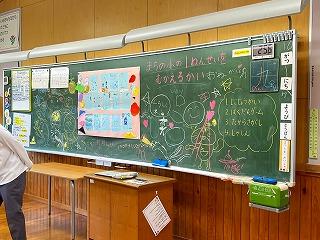 教室の黒板も歓迎の言葉とイラストで飾られていました。