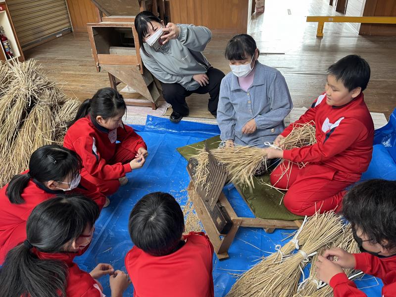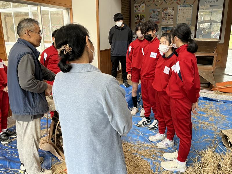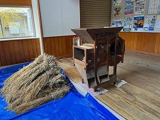 田んぼの先生、本手さんが米の脱穀体験をさせてくださいました。米づくりの学習もいよいよ最後です。
