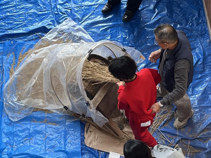 稲のたばを広げながら少しずつ粒を落としていきます。昔の人の苦労が分かります。