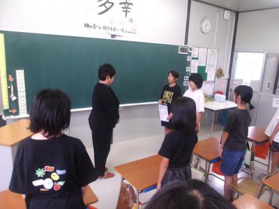 7月17日(木)に、能登町教育長 眞智 富子様をお迎えし、6年生が能登町児童・生徒提案型学校生活充実化事業補金の提案を行いました。 能登町児童・生徒提案型学校生活充実化事業補金は、能登町に寄せられた義援金を元に、子どもたちの発案した計画を実現しようと提案されたものです。本校も学校を代表して6年生が本校に割り当てられた金額についての使い道を考え、意見をまとめ、本日教育長様に提案書をお渡ししました。具体的な内容は、これから調整し確定した段階で発表したいと思います。しばらくお待ちください。提案する際の6年生の姿がとても素晴らしかったです!さすが6年生!松波小の顔として大活躍です!