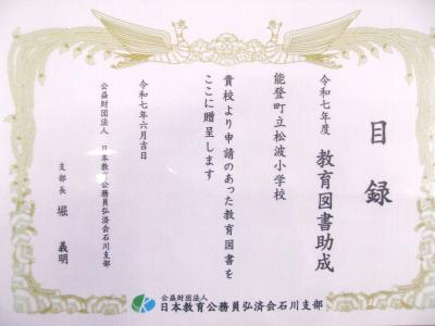この度、公益財団法人日本教育公務員弘済会石川支部様より、子どもたちのために教育図書の寄贈をしていただきました。専任幹事の茶谷 様が来校され、目録をいただきました。教育図書は、学校の希望に沿って発注していただき、間もなく届く予定です。