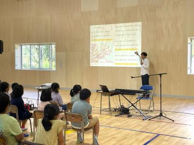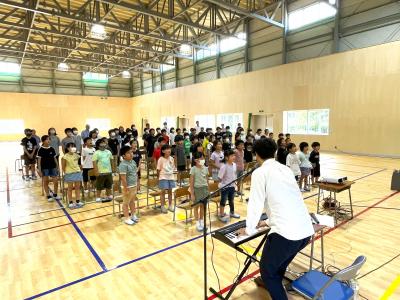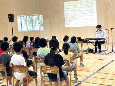 10月1日(火)弓削田 健介(ゆげた けんすけ)さんによる「いのちと夢のコンサート」が本日新しく完成した松波小仮設体育館で行われました。キーボード弾き語りとお話を組み合わせた、楽しい心が穏やかになる時間でした。スライドに歌詞や写真、絵本や動画を映しながら、「ハナミズキ」の弾き歌い、「believe」は児童も一緒に歌いました。