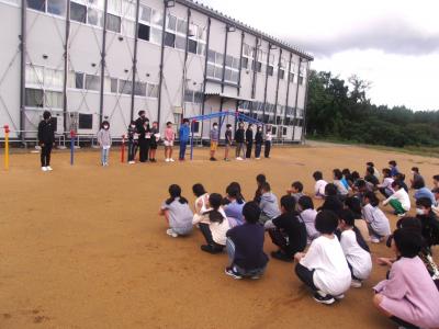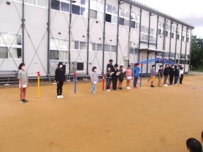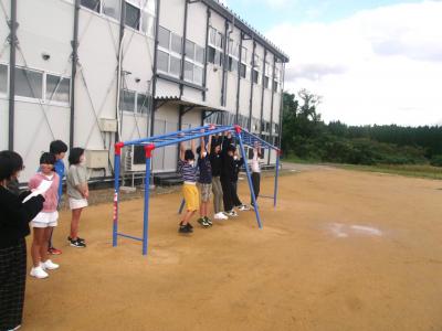 10月9日(水)です。朝から曇り空で少しすっきりしない天気です。今日の朝タイムに新しくできた遊具のお披露目式を6年生が中心となって行いました。この遊具は、能登町にいただいたご寄付の一部を能登町の各小中学校に配分される補助事業があり、いただいたご寄付で念願だった雲梯と鉄棒を設置しました。6年生が、鉄棒や雲梯の技披露や使い方・注意を伝えていました。ぜひ有効に使い体力アップにつなげてほしいと思います。ご支援いただいた皆様、本当にありがとうございました。