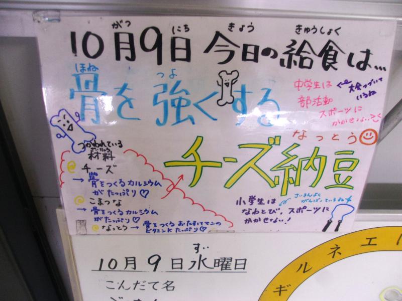 松波小学校仮設校舎の玄関を入って突き当たりに、給食についてのコーナーがあります。その一角に、今日のメニューのトピックを載せている看板があり、登校してきた給食大好き児童の楽しみになっています。松波共同調理場の高橋栄養教諭が毎日書いてくださっているものです。カラフルな色彩で読んでいて給食がより楽しみになる内容です。今日のトピックは・・・・。