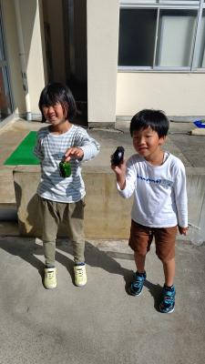 毎朝玄関に立っていると、1年生はアサガオに2年生は野菜に水やりを行っています。そこで今日はなんと2年生の野菜に収穫があったようで見せてくれました。なすとピーマンです。それぞれ1個ずつですが、収穫できてとても嬉しそうでした。