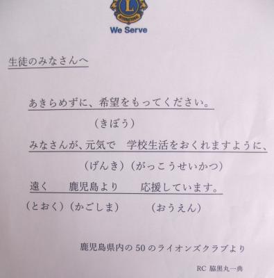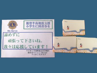 鹿児島県内の50のライオンズクラブ(ライオンズクラブ国際協会337ーD地区 鹿児島リジョン)の皆様より、子どもたち全員に図書券が届きました。お手紙の中には、「みなさんが、元気で 学校生活をおくれますように、遠く鹿児島より応援しています。」と書かれていました。図書券で大好きな本を買って読むことで、笑顔が増えますね。鹿児島県内の50のライオンズクラブの皆様、本当にありがとうございました。