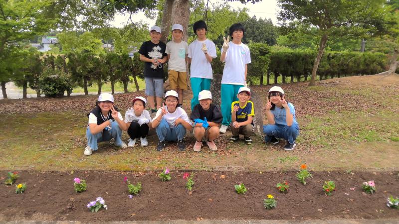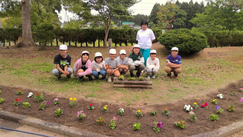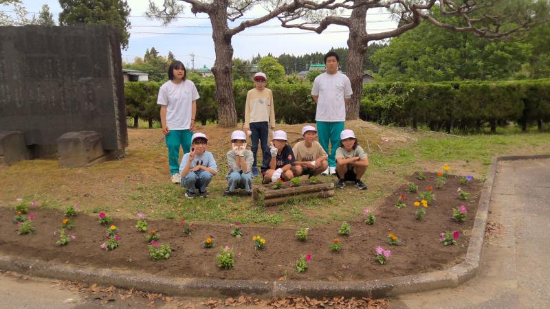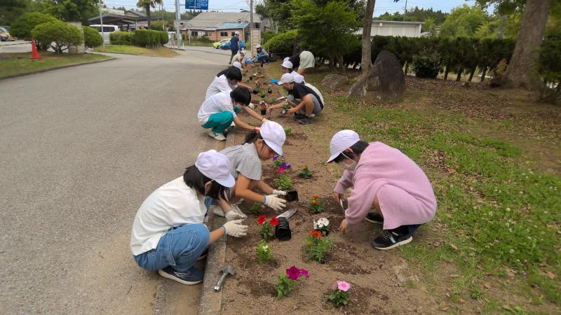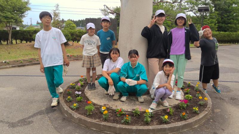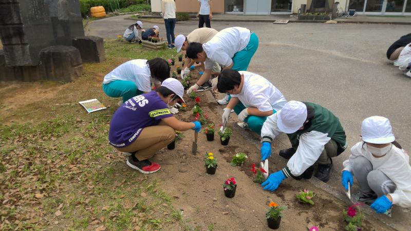 6月6日(木)5限目、松波中学校玄関前の花壇に花を植えました。小学校5年生、6年生、中学校2年生が協力し、あっという間に色鮮やかな花壇に変身させました。