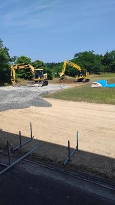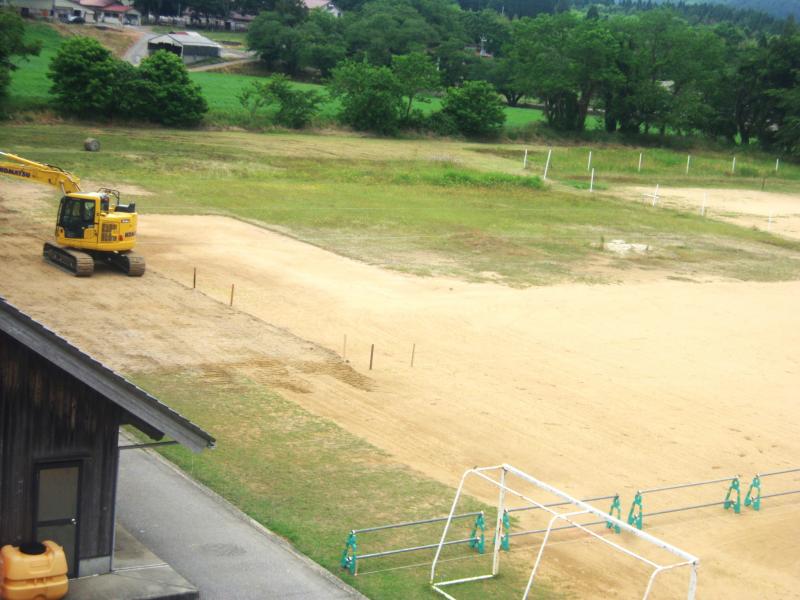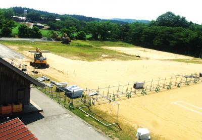 工事車両の進入路をつくっています。子どもたちには、近づかないように話をしてあり、この後大きな柵で区切られるようになります。安全に配慮しての工事になります。