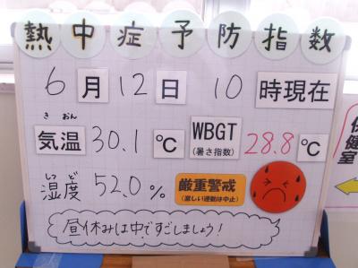 6月12日(水)です。今日は朝から素晴らしい天気ですが、気温がぐんぐん上がってきました。午前10時現在で気温30.1度、WBGT28.8、湿度52%で熱中症厳重警戒となりました。授業中は、エアコンを使い、水分をとることを定期的に声かけをしながら、1日過ごしたいと思います。暑さに慣れていない時期です。注意深く子どもたちの体調を見守りたいと思います。