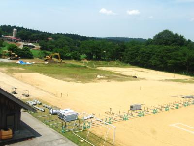 子どもたちの遊んでいる様子の反対側を見ると松波小学校仮設工事の様子が良く見えます。前回のお知らせから少し進んで、大型トラックの進入路を整備している様子を見ることができました。
