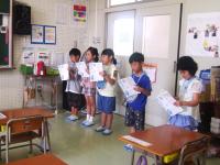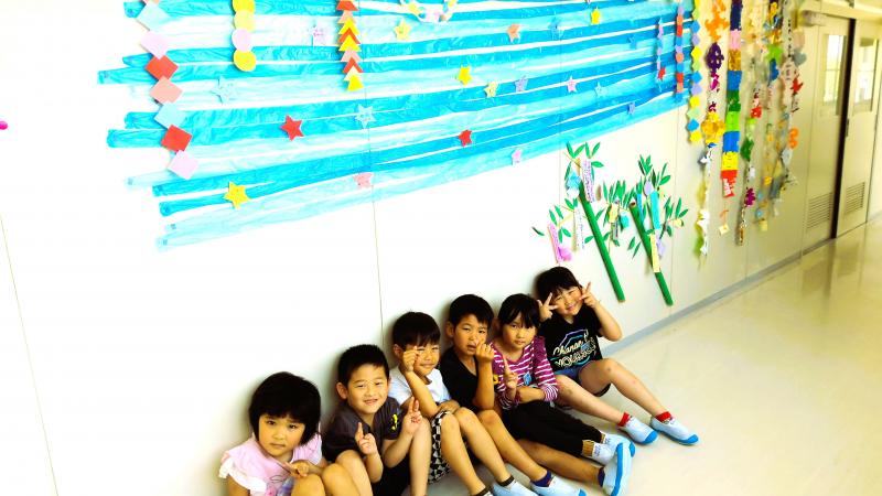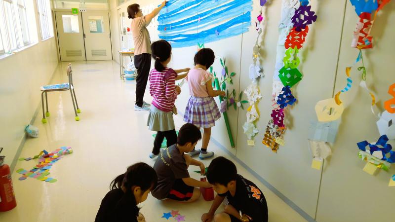 今日は1年生が七夕づくりをしていました。自分の願い事をしっかりとていねいな字で書き、先生と一緒に飾り付けができました。1年生の願い事は、とっても素敵な願いがたくさん書かれています。願いが叶うといいですね!