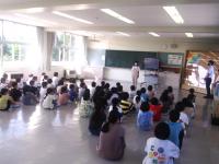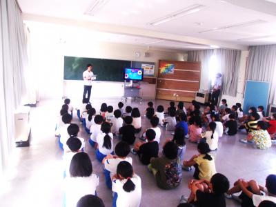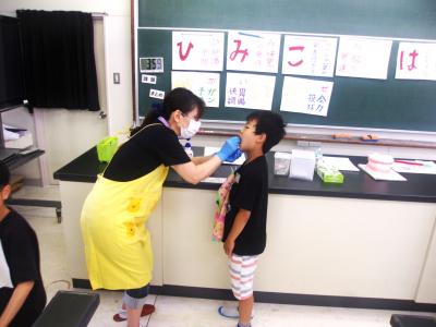 6月13日(木)の6限目に3年生が歯みがき教室に参加しました。講師をしていただいたのは、ヤマト屋薬局の松原歯科衛生士さんです。歯のクイズから始まり、染めだしをして観察したあと、正しい歯みがきの仕方を習いました。給食後歯みがきをきちんとした子どもたちですが、磨き残しが染色され、自分の歯みがきの癖がわかったようです。たくさん磨き残しがあってびっくりしていた児童もいました。