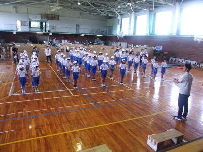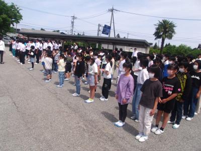 5月30日(木)です。今日は朝からとても良い天気となりました。今日のお昼休み後、小中合同の避難訓練が行われました。小学校単独での避難確認は行っていましたが、合同の避難訓練は今回初めてでした。通常中学校校舎での火災通報等は全て中学校職員室に集約されます。このことから、中学校主体での避難訓練の必要性を感じ、今回の実施となりました。訓練では、口にハンカチをしっかりとあて、「お・は・し・も」をしっかり守り避難することができました。避難階段も利用する場面もありましたが、安全に全員が避難できました。真剣さが伝わる避難訓練でした。