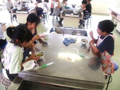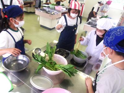 5年生は、5限目に家庭科の学習で「青菜のゆで方」を実習しました。ガスコンロの使い方を学び、お湯を沸かします。青菜は沸騰したお湯に入れてゆでます。どの班でも上手にゆでることができました。ゆであがった青菜は、そのまま味わい、鰹節をかけて、醤油をかけてという味の変化も楽しみました。子どもたちは、自分でゆでただけに、いつもより、美味しく食べれたようです。6限目は、ゆで卵をゆでます。ゆで時間によってどのように変化をするかも学びます。学んだことを家庭生活に生かしていきたいです。