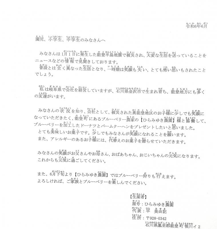 今日は、岐阜県で会社を経営しているか方(匿名)から、能登町のブルーベリー農家の平 美由記様と協働で、子どもたちに笑顔になってもらいたいということで、全校児童にドーナツとバームクーヘンの寄贈がありました。とても美味しそうなお菓子で子どもたちも大喜びでした。心が温かくなり癒やしになってくれればと思います。