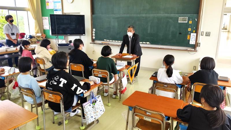6月3日(月)5限目の6年生の総合的な学習の時間にゲストティーチャーが来校されました。6年生は総合的な学習の時間で「発見!発信!!能登町の魅力(キャリア)」というテーマのもと、一人ひとりが課題を設定し学習を進めています。今日はその一環として、ゲストティーチャーの方が来校されたということです。本日ゲストティーチャーとしてお招きしたのは、社会福祉法人 長寿会 特別養護老人ホーム長寿園の常務理事で施設長である橋本 淳 様です。大変お忙しい中ご来校いただきました。本校の6年生は、長寿園様と交流があり、長寿園様の花植えにお邪魔したり、運動会に長寿園の皆様が来校され応援していただきました。今年度は、今後も交流を定期的に行う予定です。