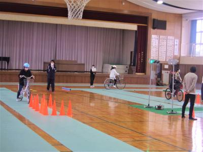 体育館での開会式のあと、1・2年生は、能登町交通安全協会松波支部の皆様・PTA環境委員の皆様のご指導のもとJA内浦町までの横断歩道の渡り方と歩行訓練を行いました。3~6年生は、DVDの視聴、体育館での自転車教室を行いました。4月からの道路交通法の改正により、自転車乗車時にはヘルメット着用の全年齢努力義務化され、改めて自転車ヘルメットの必要性をご指導いただきました。また、子どもたちは、自転車走行時の注意やポイントを警察官の実技を交えながらご指導をいただき、交差点・信号・一時停止など警察や保護者の皆様のご指摘をいただきながら、何度も繰り返し練習を行うことができました。