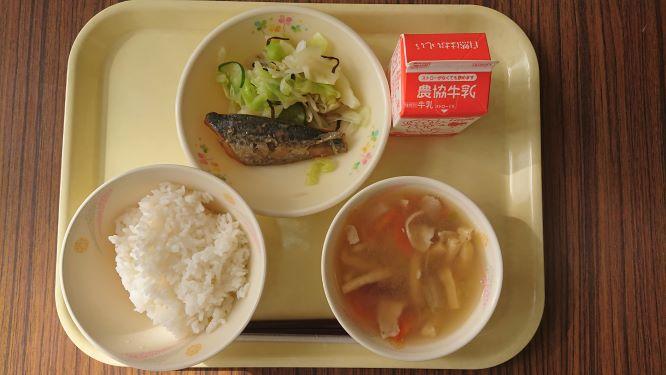 ごはん、さわらの西京焼き、さざなみ和え、めった汁、牛乳です。