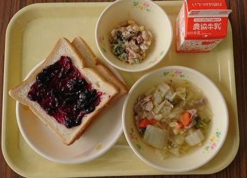 食パン、能登町ブルーベリージャム、冬野菜のコンソメ煮、大豆のコロコロサラダ、牛乳です。