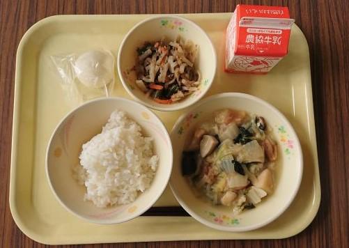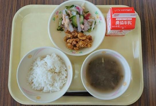 ごはん、いかのカリン揚げ、紅白大根なます、奥能登海苔のみそ汁、牛乳でした。