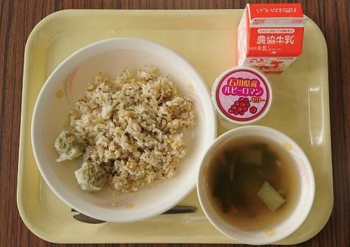 中島菜チャーハン、野菜シューマイ、チンゲン菜のスープ、ルビーロマンゼリー、牛乳でした