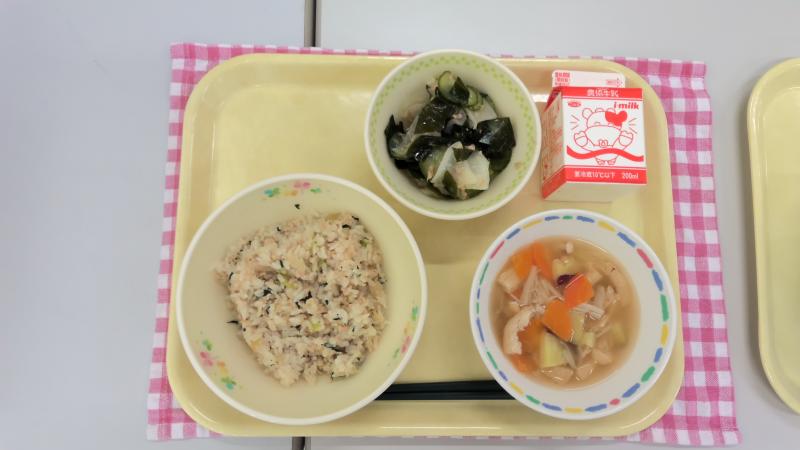 小松菜とひき肉のまぜごはん 和風サラダ みそ汁 牛乳
