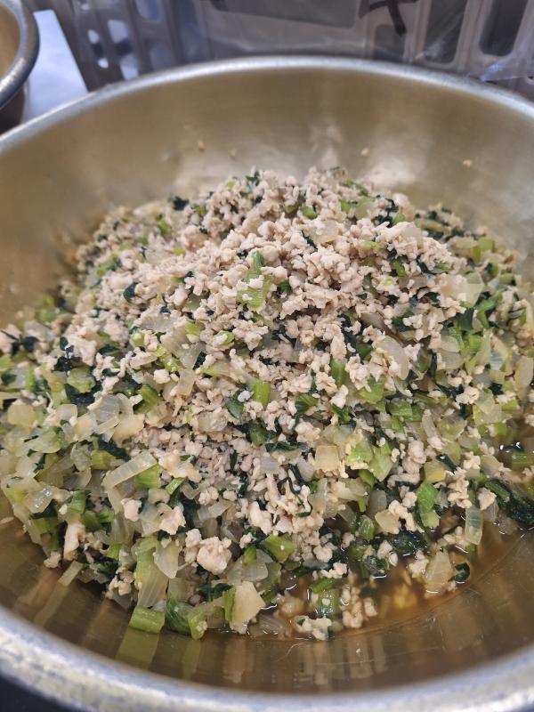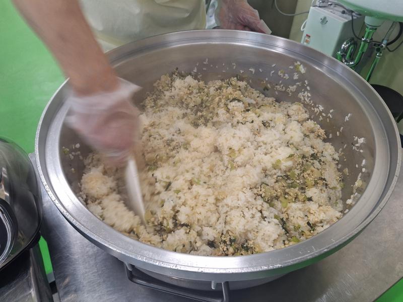 小松菜とひき肉のまぜごはんははじめてつくったレシピです。小松菜とひき肉を回転釜で甘辛く炊いたものを炊きあがったごはんに混ぜてつくりました。