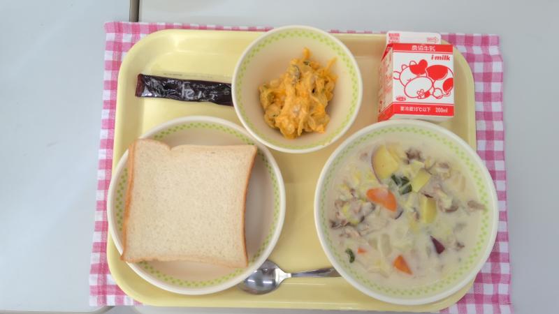 今日はパンの日です。主菜は旬のはくさいと能登町産のさつまいも使ったクリーム煮をつくりました。