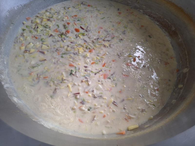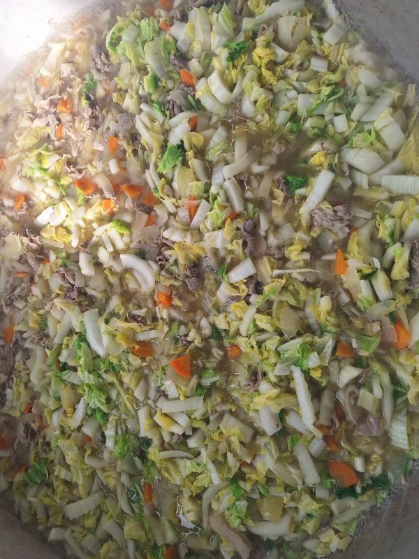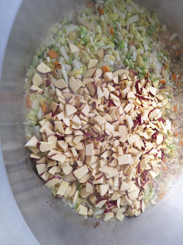 白菜とさつまいものクリーム煮はコンソメ味ではくさいとさつまいもなどの野菜や肉を煮込んだところに、牛乳と米粉をいれてシチュー風の料理にしてみました。