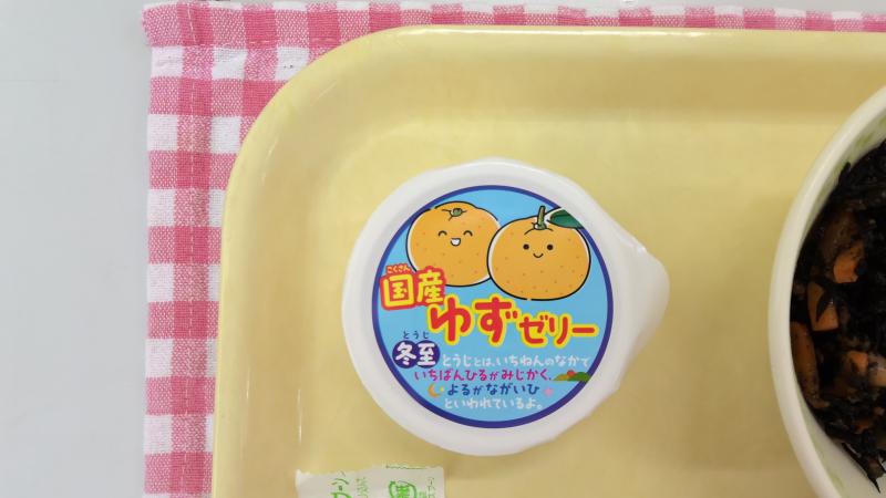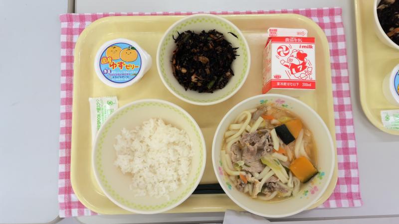 ごはん ほうとう風うどん ひじきの炒め煮 ゆずゼリー 牛乳
