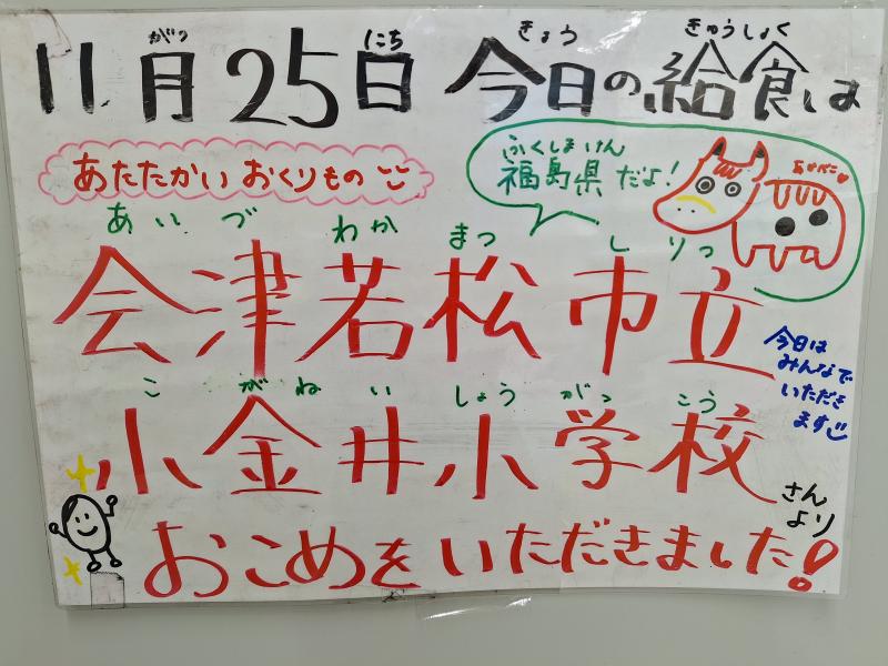 いただいたお米のことや小金井小学校のみなさんからのあたたかいメッセージは松波小学校ランチルームに掲示してあります。もう一回分くらい福島県産のお米があるので、今後楽しみにしていてください