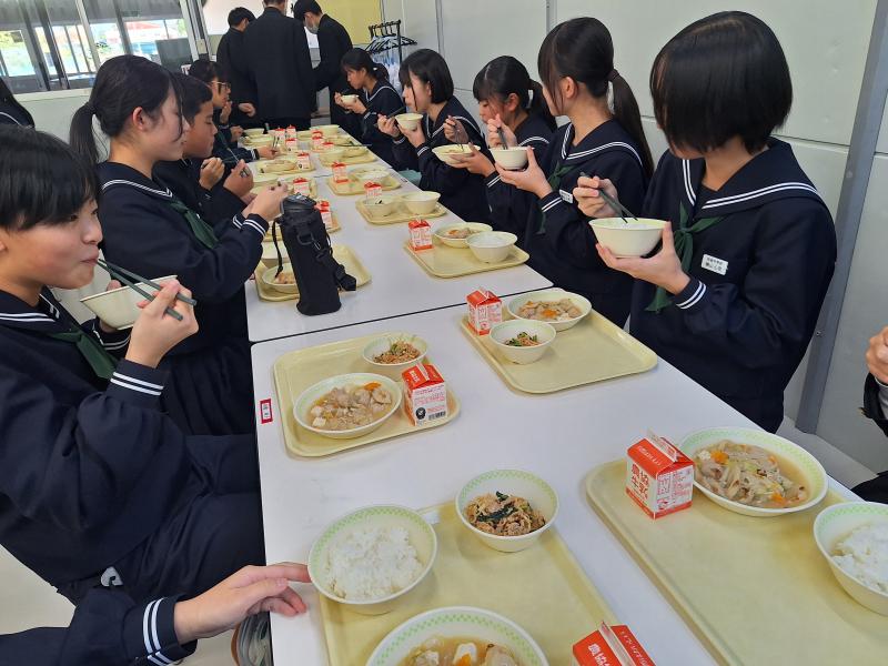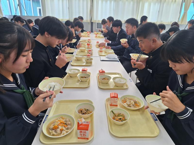 今日は和食の給食です。和食はごはんの主食を中心に肉や魚などからのおかずである主菜、野菜や海藻などのおかずである副菜、そして汁物が組み合わせています。世界的にみても健康的な食事の形です。