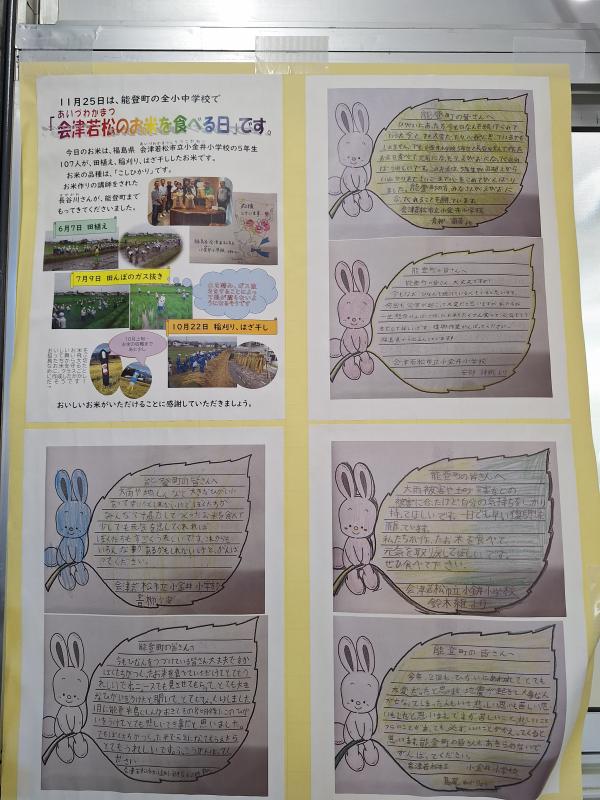 今日は能登町全体で、福島県会津若松市立小金井小学校の児童がつくったお米を食べる日でした